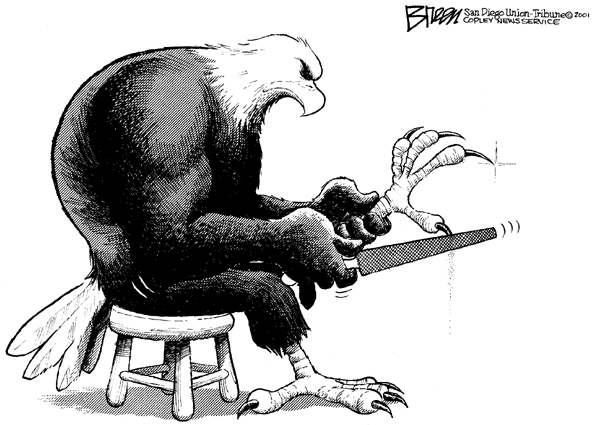 I 'm afraid of returning to my everyday world. I'm afraid, not because I think my world will be disrupted. I'm not afraid that I will be attacked, and this fear is not even because I feel any less safe than I did last Sunday night. I feel just as safe now, if not more safe.I'm afraid of returning to my life, because I fear becoming complacent, or apathetic, or forgetting, even for a day, about what happened in New York, Washington, Pennsylvania (Littleton, Oklahoma City). I'm afraid, because I fear nothing at all, within me, will be changed as a result of what I've seen. I fear that my life, save the minor inconveniences now established at airports and other areas, will remain totally unchanged. That, for me, is the most frightening thing--that I will grieve and then remain as I was. That is what most of those around me will do, and I just don't think I can be satisfied with that. I hope our leaders seek out creative solutions. Creative and unconventional solutions. We don't need more deaths for ideology, religion, and culture. I hope we can be more creative than that. For some creative solutions, click here...